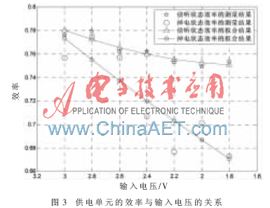 由图3可知,当输入电压在1.8 V~3 V的范围内,输出电压为3.3 V时,供电单元的转换效率在节点处于侦听状态时比节点处于休眠状态时要高,即随输出电流的增大而增大;随着输入电压的下降,供电单元的转换效率也随之下降,这会加重电池负担。为了保持供电单元的输出功率,电池不得不输出更大的电流。而受额定容量效应的影响,电池会有更多的电量无法利用。