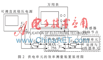 根据定义,供电单元的效率η是输出功率Pout与输入功率Pin之比,即η=Pout/Pin。本文的方法可得到输出功率与输入功率,从而得到转换效率。实验装置及连接方法如图2所示,由一台Agilent 34401A型万用表、一台可调直流稳压电源和2个作为检流电阻使用的1 Ω精密电阻构成。2个精密电阻分别与供电单元的输入端与输出端串连,这样通过万用表分别测量这2个精密电阻两端的电压,再根据I=U/R得到输入与输出电流。传感器节点的射频单元和处理/传感单元作为供电单元的负载,得到传感节点在不同工况下的转换效率。为了节省电量,传感网络节点之间应该避免频繁通信,节点在大部分时间内处于侦听或休眠状态。因此,本文仅对节点在侦听与休眠状态下的供电单元转换效率进行了测量。由于传感节点在工作过程中电池电压不断下降,而采用可调直流电源很容易模拟这一情况,另外根据P=U·I也容易求得输入功率,I由检流电阻得到。