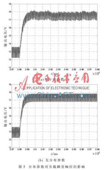 为了如实地反映电源对于负载瞬变的响应过程,要尽量减小测试装置引入的电感、电容分布参数。采用的具体作法是:缩短器件间的连线,以减小分布电阻和电感;采用小封装的MOSFET和低电感量的电阻;甚至可通过并联低值陶瓷电容来降低分布电阻和电感,通过多个电容的等效串联电阻RESR和等效串联电感LSEL相并联来降低总的等效阻抗。电路分布参数对于测试结果的影响可通过仿真说明[9],结果如图5所示。其中R1和R2的电阻值均为100 Ω,分布电感均为1 μH。