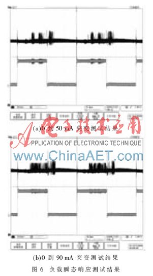 图6是供电单元的突变负载电流在0到50 mA和0到90 mA突变时的响应测试结果。从中可以得到,在负载电流发生突变的时刻,供电单元的输出电压产生了较大的过冲与下冲,并且其振荡幅度随负载电流突变幅度的增加而增加;输出电压有较大的高频噪声,并且噪声的程度随负载电流突变程度的增加而增加。以上测试结果说明,尽管该供电单元可使无线传感器网络节点正常工作,但在滤波设计上还需要进行改进。