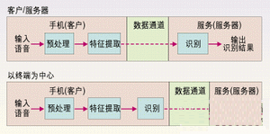 3G手机的ASR应用设计可分为两类,即以终端为中心和以客户/服务器为中心的应用。如图1所示为以终端为中心的设计方法,3G手机(终端)执行整个语音识别过程并送出识别结果。在图2所示的客户/服务器方法中,终端只是执行预处理特征提取,然后通过一个误码受保护的数据信道将这些参数发送给中心服务器,中心服务器最终完成语音识别。如果采用以客户/服务器为中心的设计方法,3G手机应使用数据信道而非移动信道来将语音发送给服务器进行识别,因为移动信道所用的低速率语音编码会严重影响语音识别的性能。