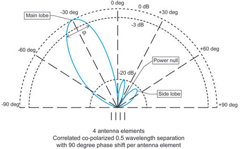 在同一个轴上与前两个天线阵元间隔半个射频载波波长的位置上添加第三个天线阵元,可改善合并后相对场强的空间选择性,见图1(c)。在此例子中,天线单元经过同极化、相关,并沿着单一天线阵元轴向均匀分隔,构成了一个均匀线性阵列(ULA)天线系统。在相对ULA宽边为0°的方向上的单一主瓣信息清晰可见。在这个方向上会发生最大相长(或同相)干扰,在合并后的场强波束方向图中产生最大的功率增益。现在我们可以看到两个不同的功率衰减零点(null)的信息,主瓣一侧位于+/-42°方位角上。这两个最小功率位置表示在合并后的场强波束方向图中发生了最大相消(或异相)干扰的方位方向。
