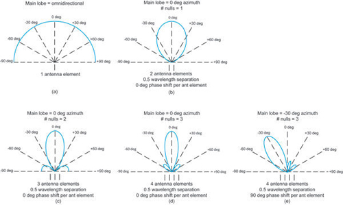 通过精心设计波束赋形天线阵列的几何形状,再加上精确控制对每个天线阵元所应用的相对幅度和相位加权,不仅可以控制主瓣功率传输的选择性形状和方位方向,还可以控制功率零点方位位置和旁瓣电平。让我们现在单独考虑添加额外的天线阵元对在目标设备接收机上观测到的结果波束方向图的有效功率增益的影响。