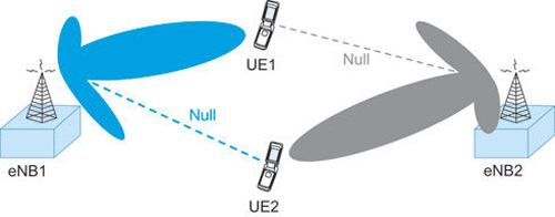 图3(a)为两个相邻的蜂窝小区,每个蜂窝小区都与位于两个蜂窝小区之间边界上的单独用户设备进行通信。此图显示,eNB1正在与目标设备UE1通信,eNB1发射使用波束赋形来最大限度提高 UE1方位方向中的信号功率。同时,我们还可看到,eNB1正尝试通过控制UE2方向中的功率零点位置,最大限度地减少对UE2的干扰。同样,eNB2正使用波束赋形最大限度提高其在UE2方向上的发射接收率,同时减少对UE1的干扰。在此情景中,使用波束赋形显然能够为蜂窝小区边缘用户提供非常大的性能改善。必要时,可以使用波束赋形增益来提高蜂窝小区覆盖率。