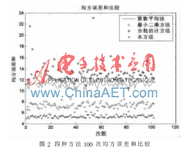 从图1中可以看出,各个时刻均方误差由大到小依次为算术平均法、最小二乘、分批估计与本方法。利用基于最小二乘和遗忘因子方法均方误差与各个时刻比较平均。把各个时刻的均方误差相加,算术平均法、最小二乘、分批估计和本方法随机试验100次得到图形如图2所示。从图2中可以看出本方法均方误差和最小。