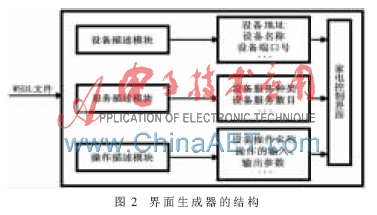 根据对设备服务描述文件的分析,将信息家电设备的服务描述分成3部分来完成WSDL文档向XML文件的转换,即设备描述模块、服务描述模块和操作描述模块,设计完成的界面生成器的结构如图2所示。