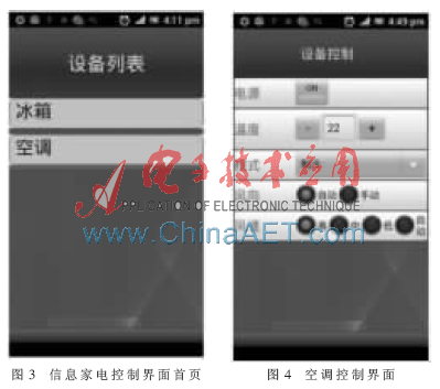 编程仿真实现虚拟冰箱和虚拟空调程序,以此分别完成对冰箱和空调的模拟。将两台虚拟设备和一台安装有界面生成器的Android设备连接在同一个家庭局域网内,开启两台设备的网络服务。根据家电控制模型,信息家电通过Web Service完成家电服务的描述以及发布,生成WSDL文档,将WSDL文档作为界面生成器的输入参数,解析转换成XML布局文件,形成Android系统的控件,区分出服务区域,得到风格统一的家电控制界面,如图3所示。用户可以通过生成的家电控制界面对家电进行操作控制。用户通过网络发送家电设备控制请求,从而完成对设备的远程控制。
