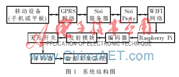 本文的远程控制系统主要由移动控制终端(具有Siri个人助理的iPhone或者iPad)、GPRS与WIFI网络、Raspberry Pi(树莓派)、SD(Secure Digital Memory Card)卡、USB无线网卡、编码器、发射模块、无线开关、解码器、数据采集系统等组成。系统结构如图1所示。