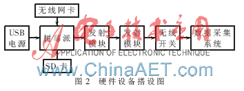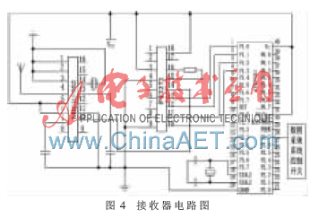 硬件的搭设如图2所示,采用5 V/1 A的mini USB通用型手机充电器作为外接电源,插入SUB无线网卡即可连接外部WIFI网络。发射器采用315 MHz发射模块,为了防止重码的产生,在发射器电路设计时要加入编码模块,电路图如图3所示。编码模块采用PT2262/PT2272,该模块是一种CMOS工艺制造的低功耗低价通用编解码电路,最多可有12位(A0-A11)三态地址端管脚(分别悬空、接低电平、接高电平),任意组合可以提供312=531 441地址码,PT2262最多可有6位(D0-D5)数据输入端,设定的地址码和数据码从17脚串行输出。此次设计采用固定编码,将A3接高电平,A4接低电平,其余管脚悬空。Raspberry Pi树莓派提供8个GPIO通用接口、1个I2C接口、2个SPI接口和1个串口,发射模块的GND连接Raspberry Pi的Ground管脚,发射模块的IN1连接Raspberry Pi的GPIO0(PIN17)管脚,IN2连接Raspberry Pi的GPIO1(PIN18)管脚,发射模块的VCC外接5 V电源。在接收器接收到信号后要经过解码器才能被识别,解码器采用PT2272,无线接收采用的是MICRF002,MICRF002是美国Micrel公司推出的完整的单片超外差接收电路,具有固定模式和扫描方式两种工作方式,主要用于无线遥控。MICRF002、PT2272和AT89S51单片机的连接电路图如图4所示。PT2272采用发射端相对应的地址编码方式,将A3接高电平,A4接低电平,其余管脚悬空,17管脚接数据采集系统的控制电路,MICRF002的14管脚接外部时钟;单片机的P1.0、P1.1、P1.2、P1.3口作为数据的输入端接PT2272的输出端,P2.7口作为数据输出端外接数据采集系统控制开关,EA/VPP端接高电平,CPU首先执行片内程序存储器中的程序,然后自动转向执行片外程序存储器中的程序,XTAL1和XTAL2接外部时钟。