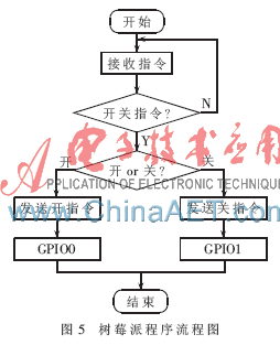 无线开关是采用射频识别(Radio Frequency Identification)技术,用无线遥控器控制各类灯具、门、窗帘等家居用品的一种新型智能开关,也可用于工业设备的开关。无线开关可以进行对码,所谓对码是接收器对发射器的地址码和控制码进行学习的过程,通过对码建立主控与受控的关系,基于此原理就可以用电脑代替遥控器实现遥控器的功能。给Raspberry Pi装上键盘和显示器,便于程序的开发与调试,首先将Raspberry Pi映像安装到SD卡中,在Linux系统下下载和安装wiringPi的库,安装git-core:sudo apt-get install git-core;下载winringPi库:git clone git://git.drogon.net/wiring;Pi编译和安装库:cd wiringPi,./build,另外大家可以使用cd wiringPi,git pull origin命令对库进行更新。在图形操作界面中运行IDLE 3(Python的集成开发环境),编写遥控程序,程序流程图如图5所示,开启指令和关闭指令分别通过管脚GPIO0和GPIO1发送出去。