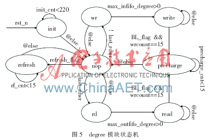 本设计将SDRAM配置成BL=8(8 bit突发读写长度),CL=3(CAS Latency为3个时钟周期,即在读命令发出后3个时钟周期,DQ端才出现读出的数据)。degree模块状态机如图5所示。