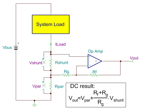 要降低该误差,应将 Rg 连接至 Vpar(Kelvin 连接 Kevin-connection)。下图 4 所示为运算放大器不将增益应用于寄生电压,而其仍然出现在输出端。Vpar 随负载电流及 PCB 制造容差变化而变化。