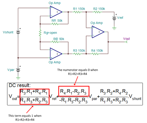图 5 所示为 Kelvin 连接(Kevin-connected)至分流电阻器时,仪表放大器如何消除误差。图 5 中的方程式可简化为 Vout=Vref+Vshunt (注意 VPAR=0)。