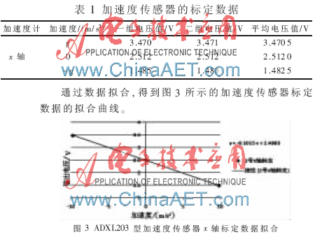 加速度传感器的通频带从零开始,故可以用静态标定代替动态标定,只要将加速度计合理地定位,利用其受到的已知的重力加速度(当地约为9.794 m/s2)即可以进行标定。标定结果如表1所示。
