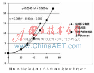 对各初速度下实测得到的制动距离S取算术平均值,并以初速度值为自变量,制动距离S为函数,进行二次函数拟合,得到S=0.005V02-0.004V0-0.002。
