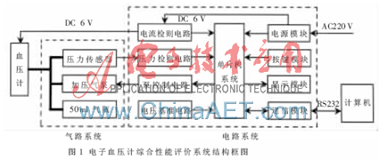 目前市场上电子血压计品牌众多,但无论哪种品牌的血压计,其性能评价指标概括起来主要包括:血压计静态压力评价、加压特性曲线评价、血压计消耗电流评价等。通过对这些性能指标的评价,可全面判断血压计的质量状态[1-3]。图1为电子血压计综合性能评价系统结构框图。系统由电路系统和气路系统两大部分组成,其中电路系统由单片机系统、压力检测电路、电流检测电路、泵控制电路、电压基准电路、多路电源、显示模块、按键模块和通信模块等构成;气路系统由压力传感器、气瓶、加压气泵及气路配件组成。