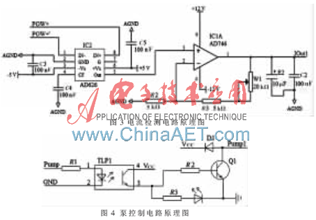 系统中电流检测电路采用仪表放大器AD626配合运算放大器AD746设计,实现毫安级电流的高精度测量,将0~500 mA电流转换为0~5 V电压,供单片机采样处理。电路原理图如图3所示。AD626设计放大倍数10,实现电流采样信号的差动输入与放大。