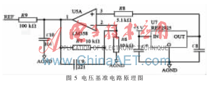 STC12C5A单片机自带的A/D采用VCC作为参考电压,而供电电源VCC是不稳定的,这就使A/D采样的结果不准确。为了提高A/D采样的精度, 系统设计了如图5所示的电压基准电路,用于消除电源电压带来的误差[6-7]。测量时,先测量该基准电压VREF,得到该基准电压的对应测量值A;再去测量被测电压U,得到测量值B。实际电压则是U=VREF×B/A。