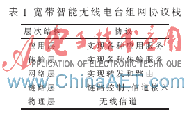 根据无线电台组网、OSI经典的7层协议模型、TCP/IP的体系结构的特征,可将宽带智能无线电台组网协议栈分为5层,如表1所示。