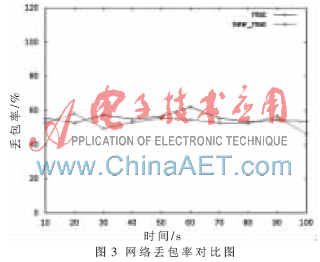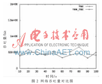 将改进的MAC协议与NS2中现有的MAC协议的性能进行仿真对比,在该仿真过程中,网络使用恒定速率(CBR)的数据流向两个节点发送数据, 仿真时间为100 s,画出网络吞吐量、丢包率与时间的关系图,仿真结果如图2、图3所示。