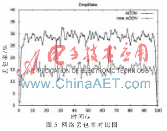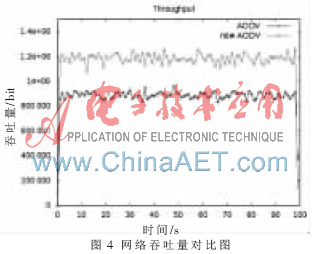 仿真结果表明,在通信环境相同的条件下,改进的AODV协议较现有的 AODV协议有更高吞吐量、更低的丢包率。因为改进的AODV协议中,采用了洪泛机制,节点发现邻居节点的功率值要大于原来路径上的邻居节点的接收功率,节点的发送包的路由会自动切换,所需时间短。而现有的AODV协议中,只有当节点能量小于阈值时,才开始切换,切换前会丢掉很多的数据包。