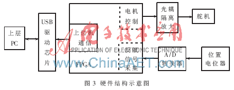 面部驱动系统是仿人机器人控制系统的一个组成部分,面部单元运动指令由上层PC机完成。因此,本文将面部驱动系统划分成电机控制、反馈信号采集和上位机通信三个部分,图3所示为硬件结构示意图。