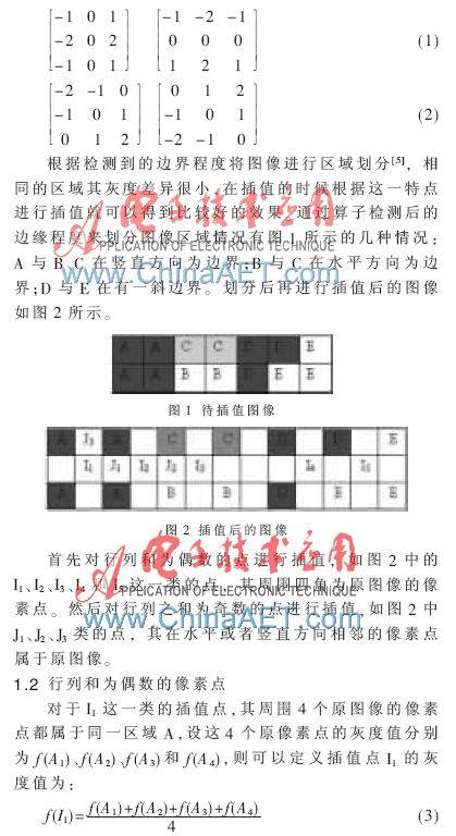 本文先通过较快速、简便的算法找出图像的大概边缘程度,再根据此边缘程度信息来划分区域后作插值算法。在插值过程中采用两步来插值,即先对行列之和为偶数的点进行插值,再对行列之和为奇数的点进行插值。对于两步中的不同类插值点分别采用不同的方法来进行插值。