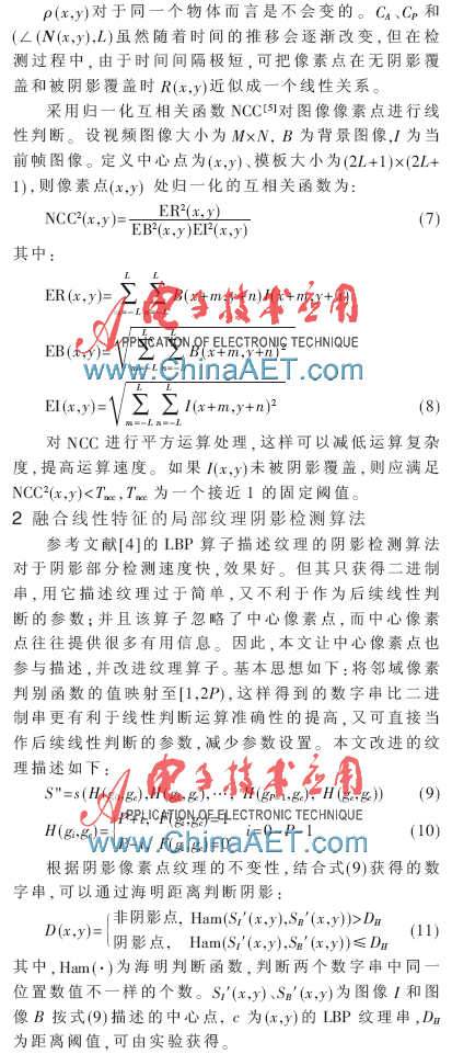 对于阴影的检测方法大体可分为:模型法、属性法和纹理法3类[1]。前两种阴影检测算法要么需要基于先验知识,计算量大,要么需要从实验中提取阈值,随机性较大,不能同时兼顾实时性和准确性。阴影检测纹理法则是利用无阴影背景纹理和阴影背景纹理相一致的特性。参考文献[2]分析了光照模型像素点在阴影覆盖和未被阴影覆盖时成近似线性关系的特性,提出了用归一化互相关函数判断阴影。该方法参数设置简单,但该方法描述纹理较粗糙,且需要对所有前景像素点进行判断,计算量大,实时性较差[3]。参考文献[4]提出了一种非常简单有效的LBP算子来描述纹理,该方法也已应用到在阴影检测方面。张玲等[5]提出了利用局部二值模式(LBP)表征纹理进行阴影判断,但该方法只采用固定阈值的差值判断,对阴影和背景的边缘以及交通视频中车道分割线的检测效果不佳。胡园园等[6]提出改进的增强局部纹理描述算子描述纹理,很好地体现了图像局部结构的特征,但纹理描述过程计算量大,且只利用纹理特征判断,容易发生将覆盖阴影的车辆(也称车辆自阴影)误检为背景阴影的现象,即伪阴影现象。
