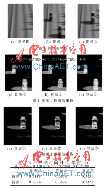 本实验工具为VC平台和Matlab,环境为:Pentium-Dual Core 2.50 GHz CPU, 2.0 GB内存。所用的数据视频图像大小为200×320,邻域大小为3×3,因此,M=200,N=320,R=1,P=8。经过实验训练学习,本文取a=1,b=3,α=0.9,DH=4,Tncc=0.98。选取基于LBP局部纹理的海明距离判断方法(算法①)以及参考文献[2]方法(算法②)与本文的方法(算法③)进行比较,抓取视频中2帧图像(如图1所示)进行实验分析,检测比对效果如图2、图3所示,算法耗时比对如表1所示。