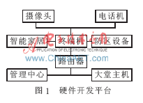 本方案的硬件开发平台主要由终端机、摄像头、电话机、管理中心、大堂主机、路由器、智能家居模块、防区模块等组成,具体如图1所示。