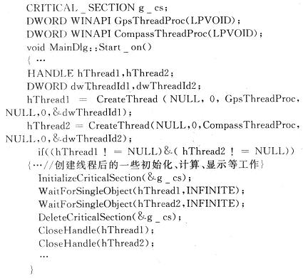 线程同步采用临界区域(也称关键区域,即CRITI-CAL SECTION)措施,首先用CRITICAL_SEC-TION申明一个全局变量,再调用InitializeCriticalSec-tion初始化,使用EnterCriticalSection进入关键区域,使用LeaveCriticalSection离开关键区域,使用Delete-CriticalSection函数删除关键区域。其关键部分代码如下: