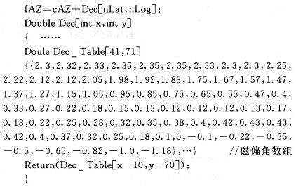 根据IGRF2005地磁场模型,利用NOAA的NG-DC提供的磁偏角计算程序,逐一计算覆盖我国领土及周边的磁偏角数据,其纬度为北纬10°~50°,经度为东经70°~140°,构成41×71的二维数组,根据经度、纬度数据提取磁偏角数据,与采集的罗盘数据进行运算,修正罗盘方位值,从而得到代表物体指向的比较准确的方位值。其部分代码如下所示:
