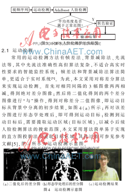 然而,基于AdaBoost的人脸检测算法易受到纹理干扰而造成误检,所以可以考虑引入其他信息来提高人脸检测算法的性能。考虑到在视频监控的应用中,人们往往更加关心运动的物体,因此可以结合这一应用特点引入运动和肤色信息来排除复杂背景对人脸检测的影响,进而提高检测速度。为了提高视频序列中人脸检测算法的性能,降低误检率,本文提出一种结合运动检测、AdaBoost人脸检测和肤色确认的级联式多特征人脸检测算法CMFS(Cascade Motion Detection,Face Detection and Skin Verification)。该算法首先进行运动检测提取目标运动区域,以较小的计算代价缩减人脸检测的搜索范围;然后在运动区域中使用AdaBoost人脸检测算法检测人脸;最后再根据亮度情况自适应地选择是否启用肤色验证作为后处理,以排除纹理干扰。实验证明,本文提出的CMFS检测算法在保证检测率的同时大大降低了人脸检测算法的误检率,提高了检测速度,能满足复杂坏境变化中实时人脸检测的要求。