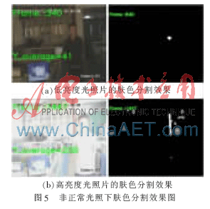 肤色是对人脸来说是很有效的特征,能有效降低人脸检测的虚假率,但肤色特征存在对光照变化敏感的缺点。由于肤色检测易受到光照变化影响,在高亮度或低亮度条件下较难分割出完整的肤色区域,如图5所示,因此肤色确认的结果并不总是可信。对此,采用自适应的方式对人脸候选区进行肤色确认。具体来说,即在得到人脸检测候选区后,CMFS算法会根据人脸候选区平均亮度自适应地开启肤色验证。如果人脸候选区的平均亮度很高或很低,则不启用肤色验证,直接判定经过人脸检测的人脸候选区为最终结果;反之,则启用肤色验证,并采纳肤色验证的结果。具体地说,肤色验证就是:如果人脸检测得到的人脸候选区中肤色像素个数占的比例很低(本文中设定为0.5),则认为人脸检测发生误检,排除该候选人脸候选区。本文通过大量的实验统计发现,易发生误检的亮度区间是Y∈[0,70]和Y∈[190,235],所以设定这两个区间分别为低亮度区间和高亮度区间,其他区间为正常亮度区间。