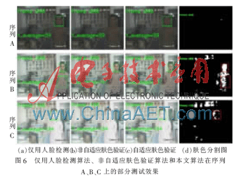 为了测试本算法对光照的适应性,拍摄了低亮度、高亮度和正常亮度下的3段序列A、B、C,分别包含500帧和500张人脸,在其上测试了仅用人脸检测算法、结合非自适应肤色验证的人脸检测算法和本文CMFS算法的性能,在3种算法前都不作运动检测处理以保证有无肤色验证为唯一变量。图6展示了3种算法对A、B、C序列的部分检测效果。从图6可以看出,在低亮度和高亮度情况下,肤色检测已经失效(如(d)肤色分割图所示),此时如果仍信任肤色,则会造成漏检(如序列A和C的(b)所示),而自适应后置肤色验证算法在非正常亮度下自动关闭肤色验证,故能保证人脸检测的检测率;在正常光照时,肤色验证能有效地排除纹理干扰,降低误检率(如序列B所示,可以看到衣服处的肤色像素值不足50%,判定为非人脸,排除此干扰)。结合运动检测,本文所提出的人脸检测算法能达到平均11.6 ms/frame,完全满足实时要求。