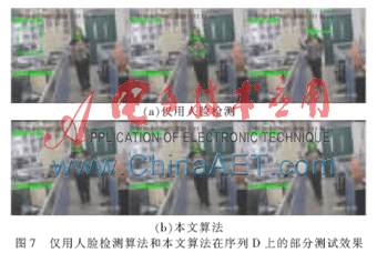 为了测试本文算法对复杂环境的鲁棒性,在较为复杂的场景下用摄像头拍摄了一段亮度正常的视频序列D(分辨率为352×288,共840帧,平均亮度范围为[70,190],该序列背景包括书架、门、箱子等)。表1为仅用人脸检测的算法与本文算法的性能比较,图7为部分检测结果。从表1可以看出,本文算法在保证检测率的同时,大大降低了人脸检测的误检率,提高了检测速度。这是因为本文所提出的CMFS算法能通过前置的运动检测减小人脸检测搜索范围,提高检测速度,并结合后置的肤色确认,有效地排除各种纹理和非肤色虚警(如图7第133帧中的衣服条纹、第122和380帧中的非肤色物体干扰)。
