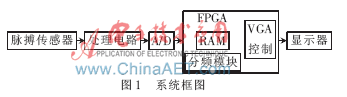 采集到的脉搏信号往往比较微弱,而且伴随着很多噪声。因此需要滤波、放大等处理电路进行预处理。脉搏信号属于模拟信号,要想送到FPGA处理,需进行模/数转换。FPGA将数字信号存储在内部RAM中,并利用Verilog HDL语言编写VGA显示控制模块,驱动显示器显示脉搏波形。整个系统的原理框图如图1所示。