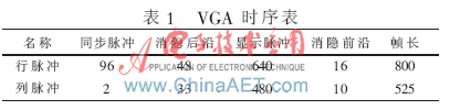 根据电视原理有关VGA显示的内容可知,VGA显示采用逐行扫描方式。扫描是从屏幕的左上方开始,从左到右、从上到下。本系统采用640×480@60 Hz显示模式,其中60 Hz为场扫描频率。对于一个场扫描频率为60 Hz、分辨率为640×480的显示模式,其典型的VGA时序表如表1所示。