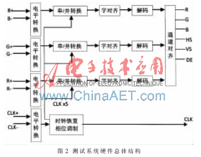 DVI接收器的系统结构包括电平转换、时钟恢复、相位调整、串/并转化、字对齐、通道对齐、解码等几部分组成,由TMDS通道传输过来的串行信号最终被转化成3路8 bit的像素信号和2 bit的控制信号,如图2所示。