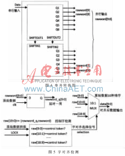 串/并转换后还需进行字对齐,ISERDES本身的BITSLIP可完成字对齐,但速度较慢,所以利用多路选择器逻辑来完成,如图5所示。其核心思想依然是靠检测控制字将经过串/并转换后的两次原始10 bit数据rawword[9:0]并接组成20 bit rawwords[19:0],然后依次检测rawwords[9:0]、rawwowds[10:1]、…rawwords[18:9]、rawwords[19:10]是否与控制字相等,若检测到相等,则必为rawwords[9:0]、rawwowds[10:1]、…rawwords[18:9]、rawwords[19:10]之一,之后即可通过多路选择器选出具有正确高低字节的数据输出。