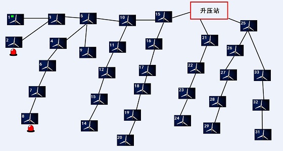 以拓扑图的形式展现风机间的组织关系,支持鼠标消息,当鼠标进入每个风机单元时,会自动显示当前风机的实时参数值。当风机有报警时,对应的报警灯会闪烁。