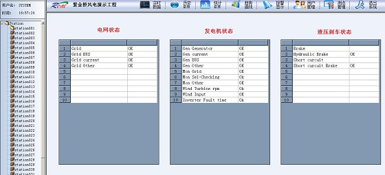 以报表、图形动画等多种形式显示当前的实时数据,并可以通过右侧导航切换不同的监控设备。数据实时刷新,能快速的获得风机的环境风速、电网电压、发电机转速、入网电流、入网功率、入网累计发电量、短路刹车状态、液压刹车状态、变流器状态等参数。