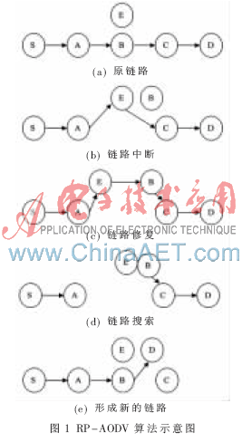 节点的移动导致节点间链路中断,但在较短时间内,节点并不会走远,仍在原位置附近,在较短时间内节点的活动范围也往往是以短途和小范围为主[6-7]。同时链路中断处也存在其他的邻居节点。因此当链路中断时可以在断点附近展开链路修复,没必要全网重新开始新的路由。如图1所示,链路中断一般有多种情况,图1(a)中源节点S和目的节点D,经由A、B、C三个中间节点组成一条链路。随着节点的移动,链路出现断裂,如图1(b)所示,B节点移动出了A的覆盖范围,A与C之间失去了联系,但是存在E节点可以同时连接A和C,则可以选择E取代B。如果E节点不能同时覆盖到A和C,但可以覆盖到A和B,如图1(c)所示,则可以在原链路中增加一个E节点,链路变为S-A-E-B-C-D。如果B和E都移动出了A的覆盖区域,如图1(d)所示,则A到下游节点的链路完全中断了,必须由它的上游节点开始新的链路搜索。