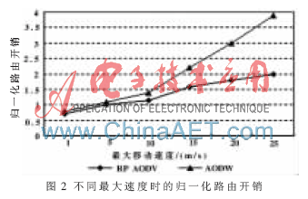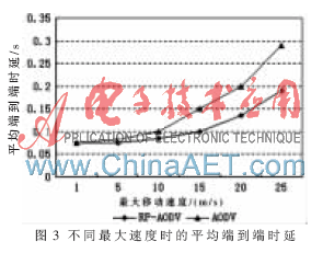 由图2可以看出,在不同的最大移动速度下,RP-AODV的路由开销最小,总体上比AODV减低了40%。说明通过新算法有效控制了链路中断的次数,减小了路由发现的频次,从而降低了路由开销。在速度较低时路径中断的概率较小,随着速度的增加,节点的移动性增强,路径中断概率增大,路由修复过程出现频繁,路由开销都有所增加,但是RP-AODV优势显现。当节点移动速度超过20 m/s以后,优势缩小,主要是因为节点的移定性增强之后,链路预测和备份链路的选择的准确性也会随之下降,增加了路由开销。总体上来看,RP-AODV相比传统AODV算法归一化路由开销降低40%左右。