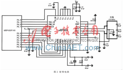 射频电路主要由三大部分组成:与单片机相连的接口电路、nRF905应用电路以及天线的发送、接收电路。在设计过程中,电源VDD引脚所接入的电压范围为1.9~3.6 V;为了使晶振稳定,在晶振两端并联电阻R1(1 M?赘);为了让监测前端得到稳定的信号,天线的电路设计尤为关键,其中,VDD_PA引脚给天线提供直流电源,ANT1与ANT2引脚给天线提供稳定的RF输出,图2所示为监测前端的射频电路。