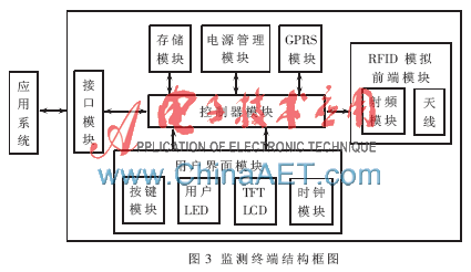 监测前端主要负责对食品质量信息的采集与计算,通过nRF905无线射频模块将数据信息发送给监测终端,并接收监测终端发送的相关指令。监测前端主要由控制模块、RFID模拟前端模块(天线、射频芯片nRF905)、温度采集模块、用户界面模块(按键模块、用于LED、时钟模块、调试接口JTAG)、电源管理模块等五大模块和相关电路组成。RFID模拟前端模块负责接收指令,并根据指令格式发送数据包;温度采集模块负责采集温度并将温度传输到控制模块;控制模块处理装置的所有数据并维护装置的正常运行,用户界面模块能够便于用户使用,电源管理模块主要为控制模块和RFID模拟前端模块供电。