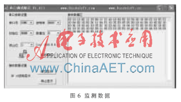 在食品运输流通过程中,监测前端通过传感器模块进行数据采集及货架期计算,然后通过NRF905射频模块将数据信息发送监测终端,监测终端再把数据发送至监控中心。在监控中心,监测终端通过RS232串口与电脑连接,从而使数据能够直接传输到PC机上。图6所示为监测前端发送到监控中心的数据,可通过串口调试精灵显示。