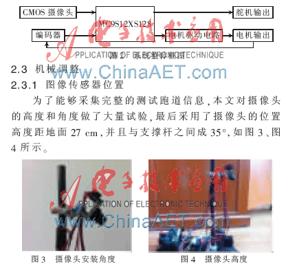 汽车在其他要素稳定的情况下,车体重量对于车的加减速性能有着至关重要的影响,因此本文的机械设计中,在布置自动驾驶模型车的传感器支架和设备时,应该尽量减少不必要的配置,使车总重尽量减轻。车体重心高低主要影响车身运动中的稳定性,对于拐弯的平滑性及稳定性有很大的影响。在车体调整以及减轻车体总重量采用以下几点:(1)将测试模型车的前后结合悬挂拆掉,仅保留前后车体连接的金属片,并用胶体加固。这样已经足够模型测试车转向时候的平衡。(2)将车上各种设备尽量布置在车体转动中心上,有利于车体在拐弯时的响应,车辆不易侧翻。比如将电池移动到车子前部,将电路板放在靠后的位置,整车的重心基本上在中间位置。(3)为了降低整车重心,本文严格控制摄像头传感器及其安装架的重量。本文采用了小巧的OV7620摄像头,重量轻但却能够满足采集图像的精度。设计了轻巧的铝合金CMOS夹持组件,便于摄像头的拆卸,并采用了碳纤维管作为安装传感器的主杆,这样不仅重量轻而且刚度也能达到要求[3]。