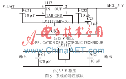 本文所设计的系统总电源供应来自7.2 V大容量镍镉电池,但是单片机最小系统和一些芯片都需要5 V的电源,SD卡和无线调试模块需要3.3 V低压,伺服电机工作电压范围在4 V~6 V之间,CMOS摄像头经过改装应用5 V供电,驱动电路需要5 V的电源,直流电机需要7.2 V电池直接供电,图5为系统的稳压模块。