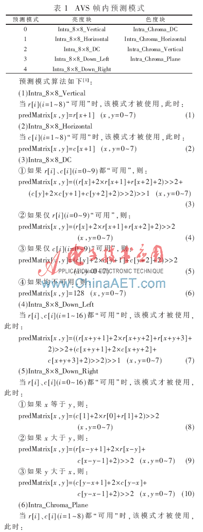 AVS帧内预测亮度块和色度块均采用8×8块,亮度块共有5种预测模式,色度块有4种预测模式,其中色度预测模式有3种与亮度预测模式算法相同。帧内预测模式如表1所示。